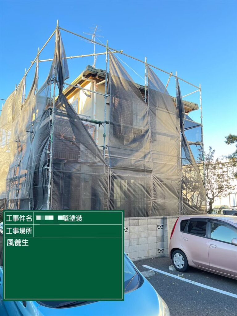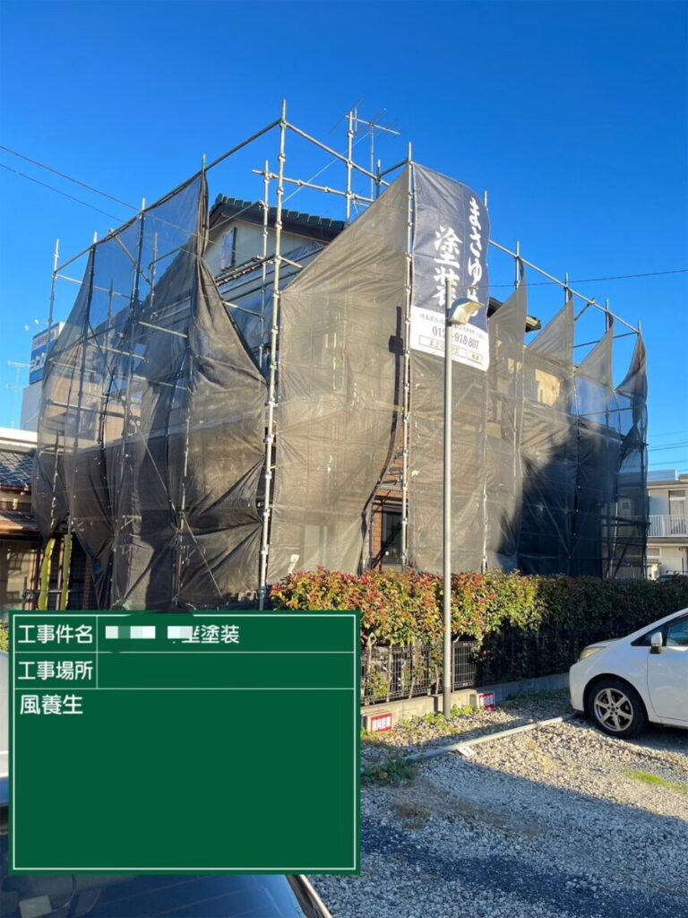 施工スタートは基本的に足場設置から始まります。施工期間中はずっと設置されているものですし作業する職人さんの安全にも関わってきます。